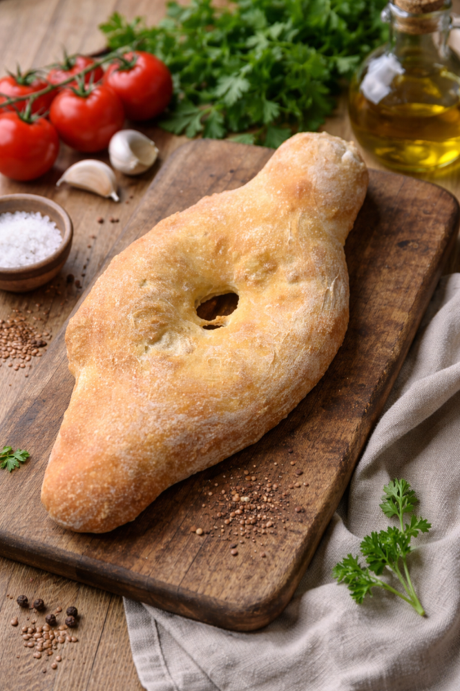 Золотиста випічка з подвійним сиром. Традиційне грузинське хачапурі з міксом сирів сулугуні та імеретинського. Хрустка скоринка зовні та гаряча сирна начинка всередині. Класика, яка ніколи не набридає.